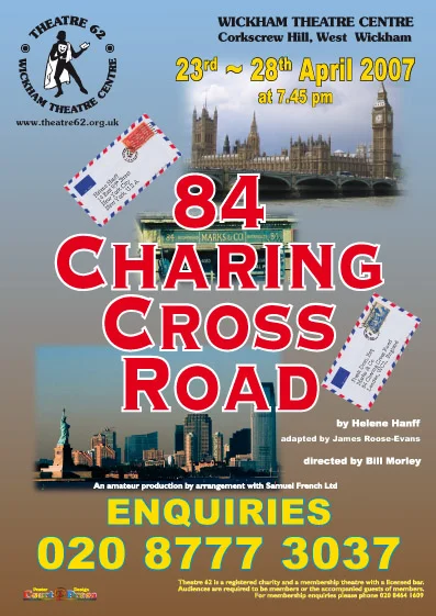 By Helene Hanff. Directed by Bill Morley. Helene Hanff in New York writes witty letters to a bookshop at 84 Charing Cross Road, London, enquiring about second hand books. Replies are sent by the stodgy and proper Frank Doel. Helene's idiosyncratic path through English literature broadens as she grows ever fonder of her friends in England. The action takes place between 1949-1971 in Helene's New York apartment, and in Marks & Co, Booksellers, 84 Charing Cross Road, London.