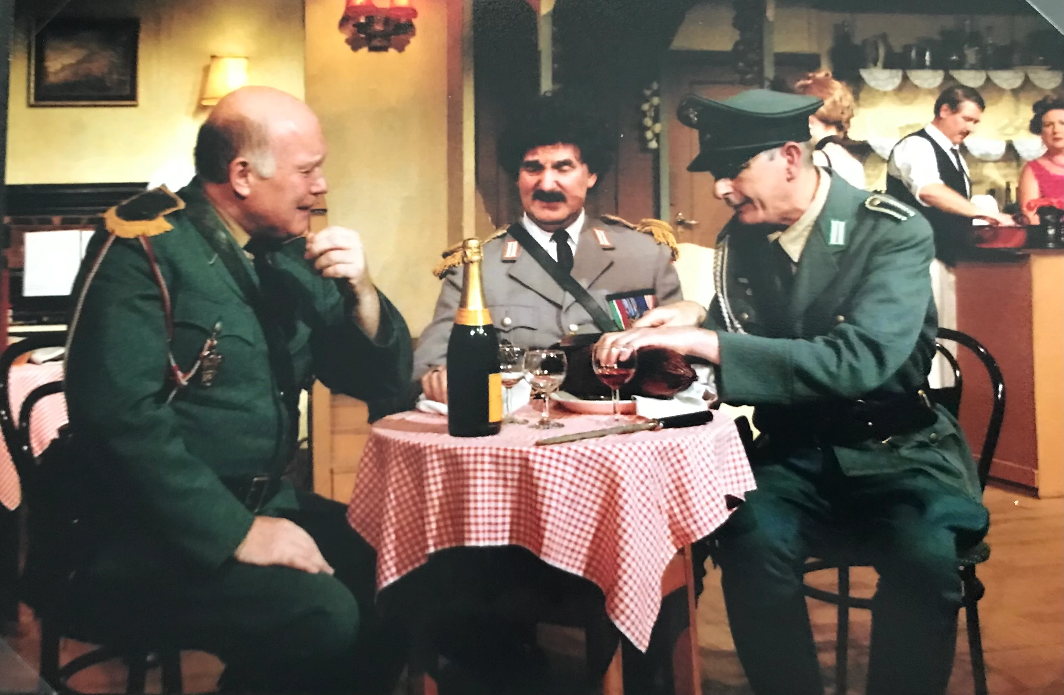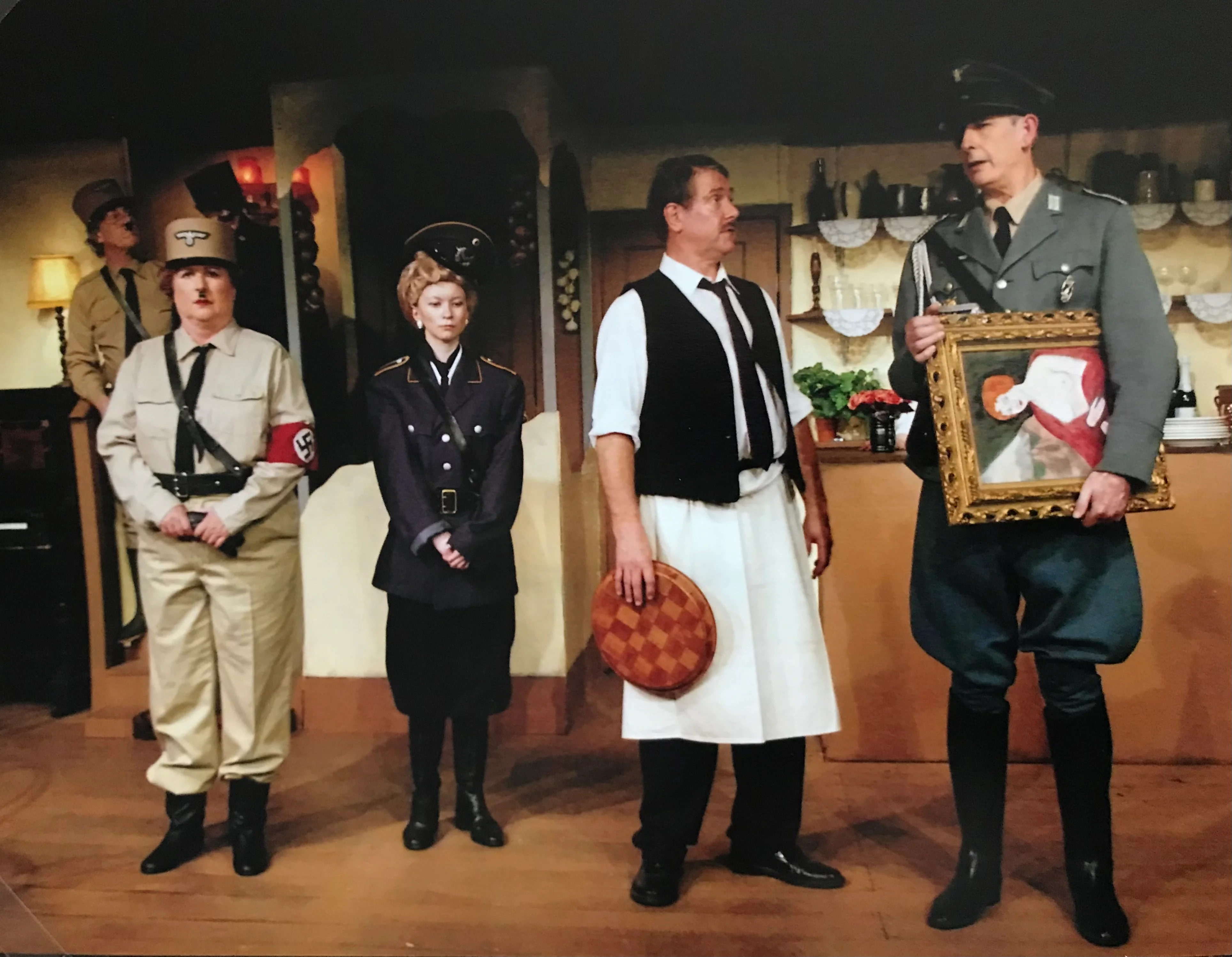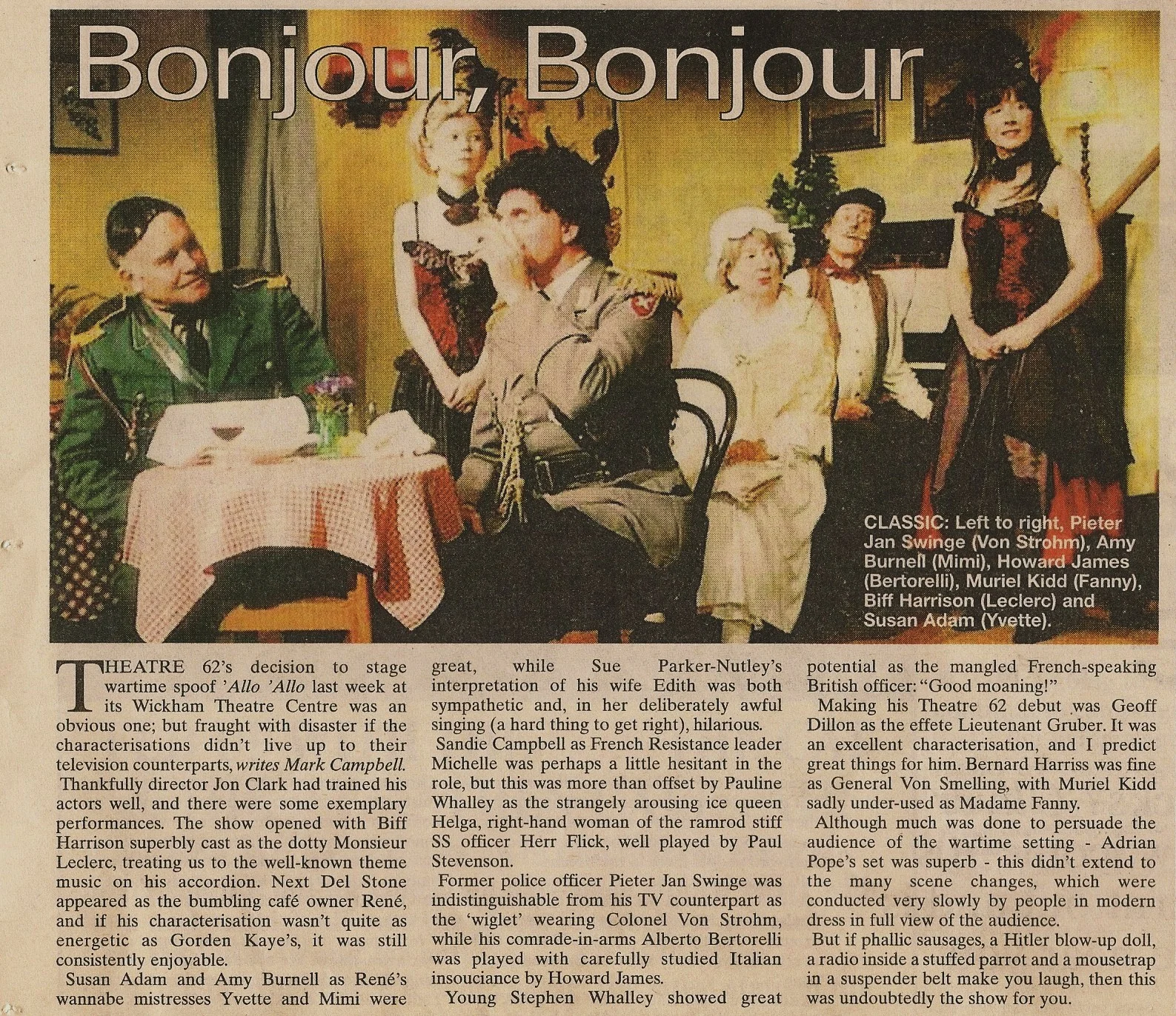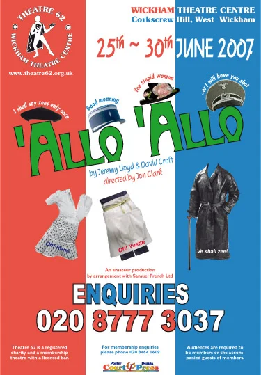 By Jeremy Lloyd and David Croft. Directed by Jon Clark. Based on the long-running BBC Television comedy series, 'Allo 'Allo follows the adventures of Rene, a cafe owner in the occupied French town of Nouvion. Rene and his wife Edith struggle to keep a priceless portrait of the Fallen Madonna with the Big Boobies by Van Klomp, stolen by the Nazis, hidden in a large sausage in their cellar. Rene is also hiding two British airmen, and with the help of the French Resistance, tries to repatriate them. Matters come to a head when news breaks that the Fuhrer is visiting the town, and the cafe quickly becomes filled with folk trying to impersonate Hitler... CastRene: Del StoneEdith: Sue Parker-NutleyYvette: Susan AdamMimi: Amy BurnellMichelle: Sandie CampbellColonel von Strohm: Pieter Jan SwingeHelga: Pauline WhalleyAlberto Bertorelli: Howard JamesHerr Flick: Paul MarshallOfficer Crabtree: Stephen WhalleyMonsieur Leclerc: Biff HarrisonLieutenant Gruber: Geoff DillonMadame Fanny: Muriel KiddGeneral von Smelling: Bernard HarrissPlumber: Jon ClarkResistance Girls: Sarah Lewis, Ruth Aylward, Viki JonesFrench Peasants: Samantha Ellery, Sue Appleyard, James Neary, Peter BidwellBritish Airmen: James Neary, James Marchant BackstageLighting Designer: David HartSound Designer: Ian JamesChoreographer: Hollie CampbellMusic Director: Biff HarrisonStage Director/Set Designer: Adrian PopeSet Construction: Bernard Hemsley, Adrian Pope, members of T62Stage Manager: Liane MarchantAsst Stage Manager: Katherine WhalleyStage Crew: Louise Messenger, James MarchantLighting Assistant: Stuart ScottSound Assistant: Sharon FowlerProps: Beryl Neal & Karen KehoeWardrobe: Eve Stone, Jon Clark, Margaret UzzellMake-up & hair: Penny Vetterlein, Jean Golder, Christine LeverPrompt: Janet Clark