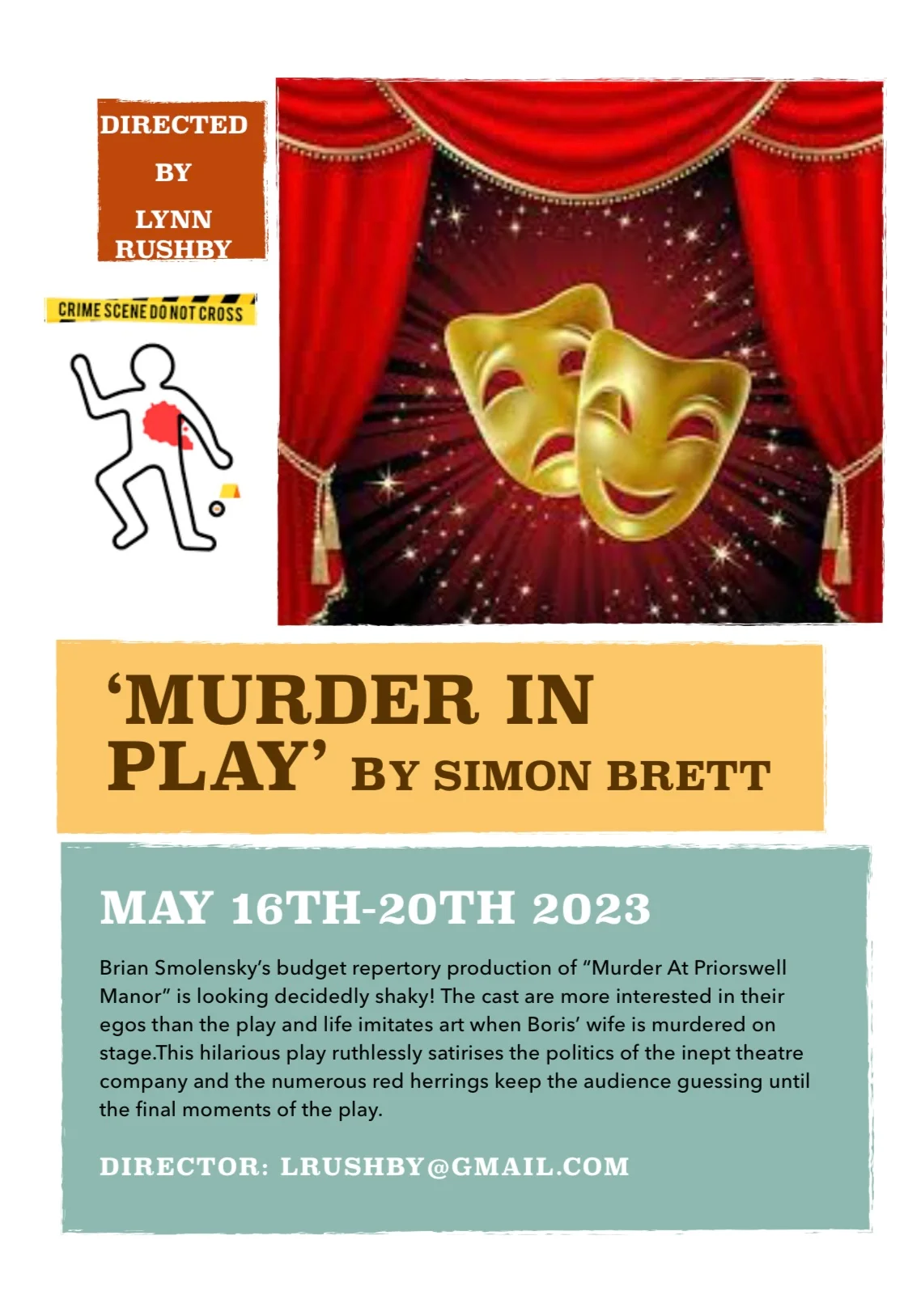 by Simon Brett. Directed by Lynn Rusby Tuesday 16th - Friday 19th May 2023 at 8.00 p.m. Saturday 20th May at 3.00 p.m. Brian Smolensky's budget repertory prosecution of 'Murder at Priorswell Manor' is looking decidedly shaky. The cast are more interested in their egos than the play - and life imitates art when Boris' wife is murdered on stage. This hilarious play ruthlessly satirises the politics of the inept theatre company - and the numerous red herrings keep the audience guessing until the final moments of the play. Photos credit: BeLouder Photography
