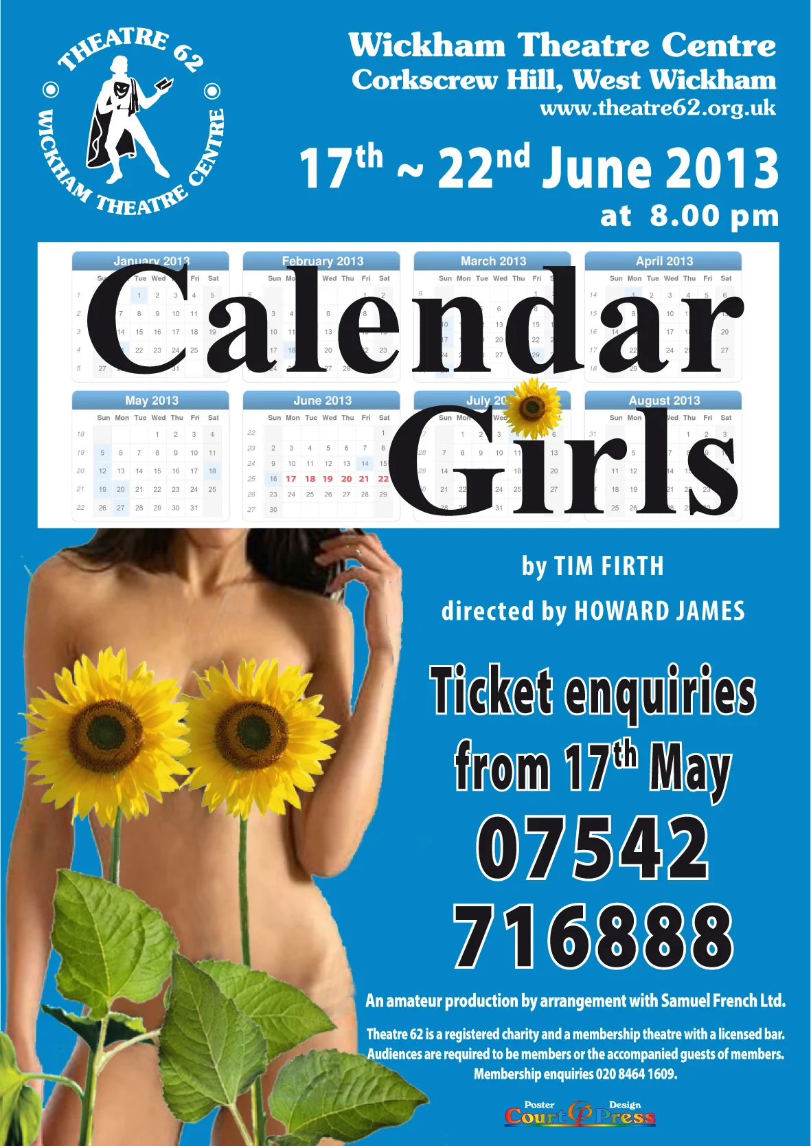 By Tim Firth. Directed by Howard James When Annie’s husband John dies of leukaemia, she and her best friend Chris resolve to raise money for a new settee in the local hospital waiting room. They manage to persuade other members of the W.I. to pose nude for an alternative calendar with help from the hospital porter Lawrence who just happens to be an amateur photographer. The news of this spreads like wildfire and the press soon descend on the small village of Knapeley in the Yorkshire Dales. The calendar is a success however a strain is put on the friendship between Chris and Annie because of their new found fame. This is based on a true story and has been performed all over the country. It was also made into a best-selling film. Find out how Theatre 62 supported Leukaemia and Lymphoma Research here.