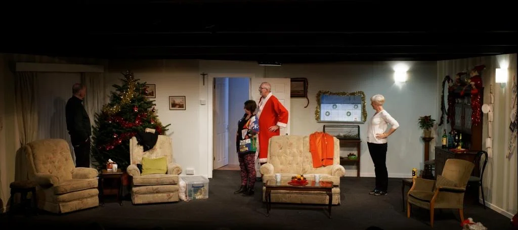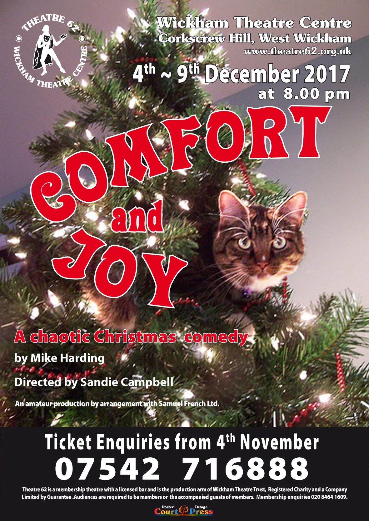 Comfort and Joy by Mike Harding Directed by Sandie Campbell Set over a three-day period from 23rd to 25th December. Goff has volunteered, yet again, to dress up as Santa and hand out presents at the old folk's home and someone has stolen his jacket and trousers. Helen has brought her dog Trumpton (who is aptly named) for the Christmas holidays. Kathy is coming to stay for Christmas and is bringing her 'friend' Crispin and her two cats because the cattery is closed (as the lady who runs it dropped dead in the Bran tub in Santa's grotto). Fiona (Goff's daughter) and Jimmy are home from Australia for the first time in 30 years and Goff has not forgiven her for running off to Australia with Jimmy and never returning tools he borrowed. Martin has bought an enormous Christmas tree 'off the back of a lorry' and has invited the new neighbours Monica and Chapman in for a drink, who turn out to be barking mad. Margaret is the peacemaker doing her best to hold it all together, but when the dog runs off with the turkey she loses the plot. Presents are exchanged, none of which are appropriately thought out, charades are played with quite a bit of cheating. The alcohol flows, tongues are loosened and buried resentments rear their ugly heads. All in all...a traditional family Christmas!