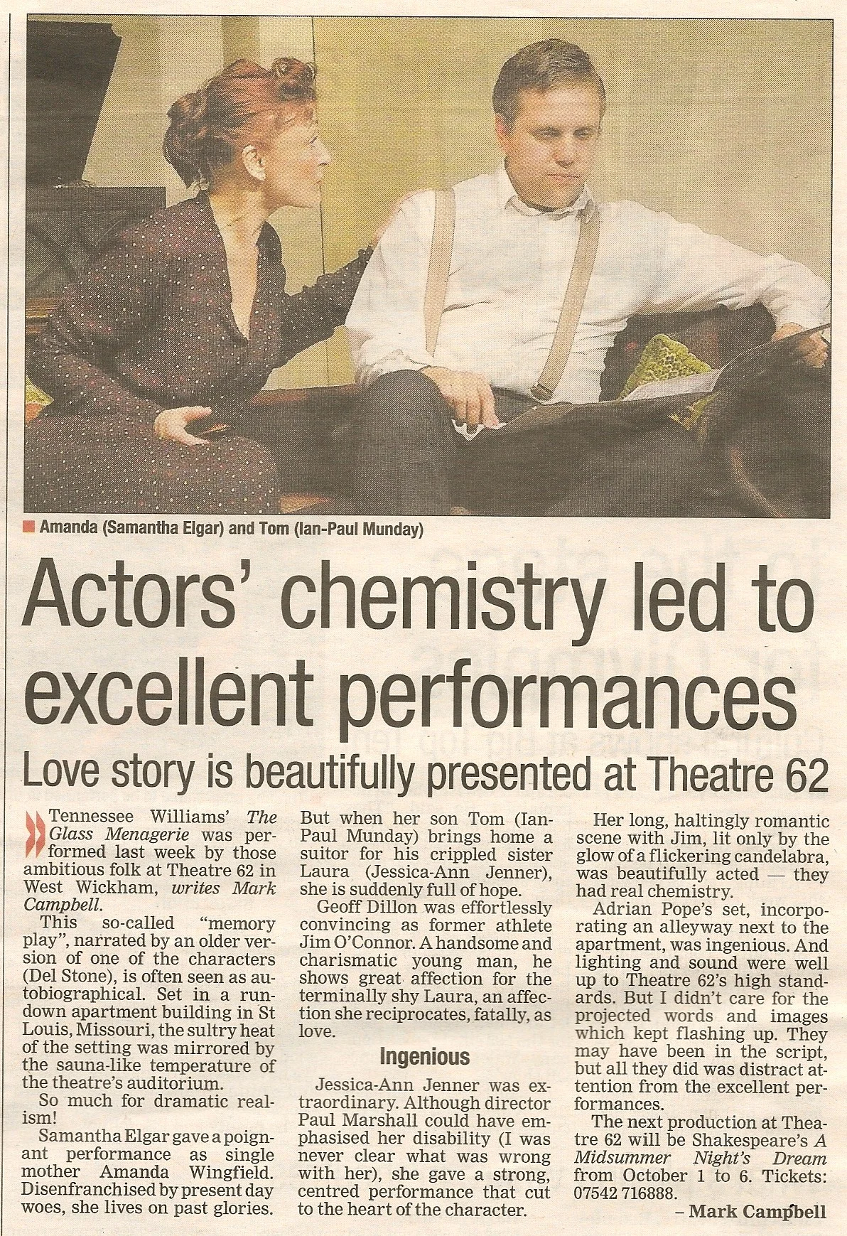 By Tennessee Williams. Directed by Paul Marshall. Tom brings a work colleague, Jim, to meet Amanda, his mother and former 'Southern Belle', and Laura, his insecure and slightly crippled sister who is absorbed by her collection of glass animals. Amanda is desperate to find a husband for Laura - but is Jim the answer to Amanda's prayers? It is a sensitive piece of drama – an intimate, absorbing and heartbreaking personal drama which examines how fragile the human heart can be, and how easily it can be broken. The Glass Menagerie won the New York Drama Critics Circle Award for Best Play in 1945 when it was premiered on Broadway. Production photos & reviews below.