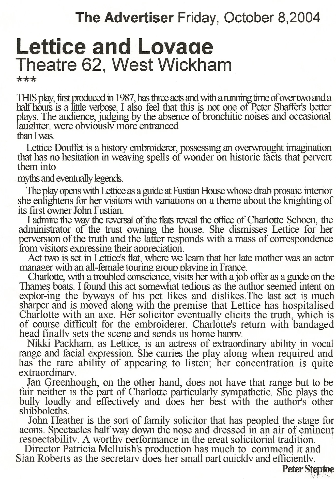 By Peter Shaffer. Directed by Patricia Melluish. Lettice, employed as a stately home tourist guide, has inherited theatricality and eccentricity from her mother. Caught embroidering the history of the house by Lotte, her supervisor, she is dismissed. During the dismissal interview they uncover common ground with the result that she and lotte develop an unlikely friendship. Cast TBC Backstage TBC