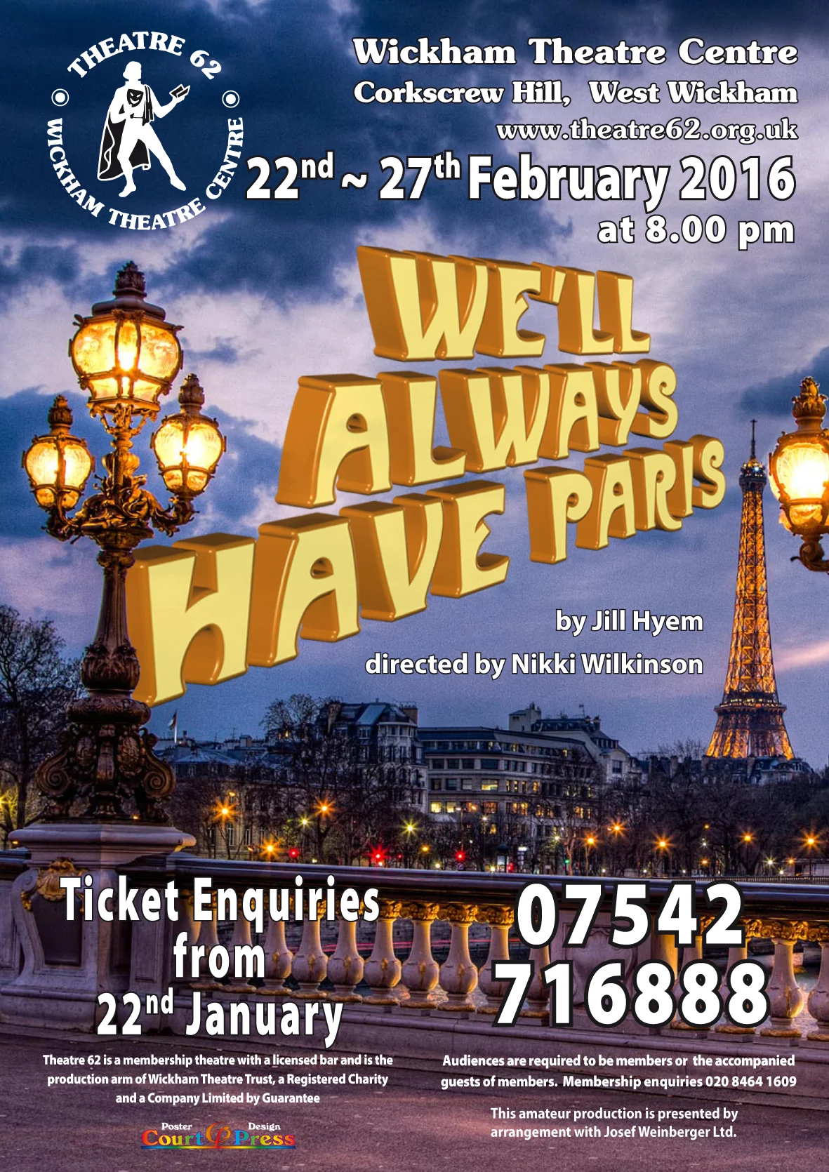 We'll Always Have Paris by Jill Hyem Three women of a ‘certain age’ gravitate to Paris. There’s Nancy, a retired headmistress determined to throw off the shackles; Anna, recently widowed – and free – after years of nursing a sick husband; and Raquel, a divorcee in search of eternal youth and a new toy boy. A feel-good play with laughter and tears, the promise of romance, friendship and anger, and the advantages and disadvantages of growing old. We’ll Always Have Paris is certainly a play that will leave audiences charmed, amused, thoughtful – and smiling.