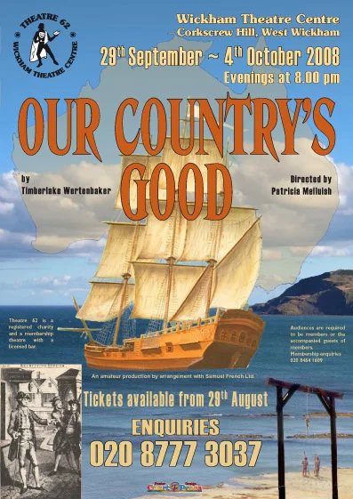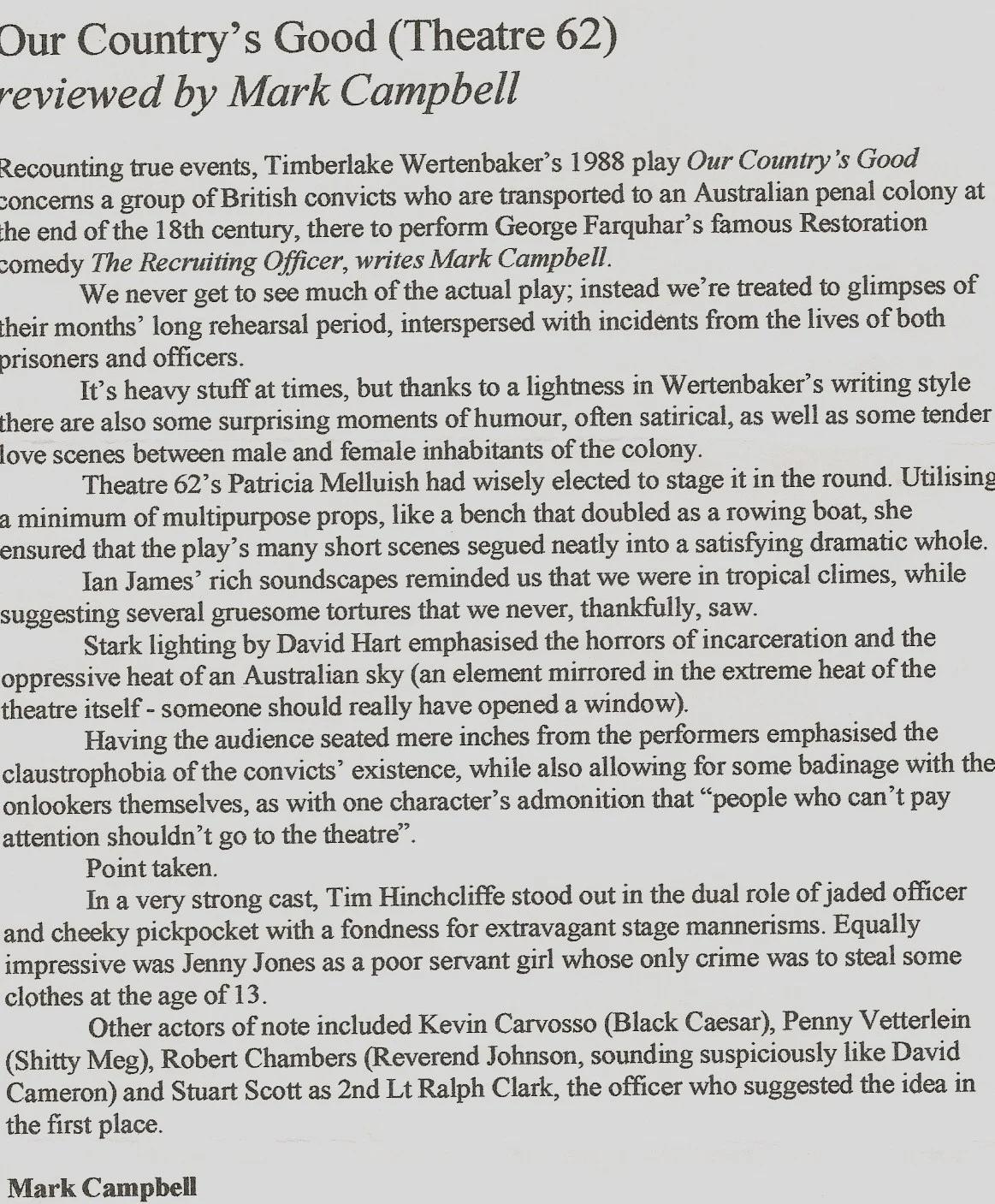 By Timberlake Wertenberger. Directed by Patricia Melluish. Set in Australia in the late 1780s, convicts are offered humanity by participating in the production of a play, 'The Recruiting Officer'. The convicts are sent by ship to Australia by the British and over time become animalistic - or so they seem to some of the officers guarding them. Captain Arthur Phillip thinks otherwise though, and asks Second Lieutenant Ralph Clark to direct a play starring the convicts. Some of the other officers are opposed, and Clark faces an uphill task of convincing the prisoners to work together. To cause further difficulties, some of the prisoners are sentenced to trials and hangings during the course of rehearsals. Cast - Officers Captain Arthur Phillip: John Heather Major Ross: John Oakenfull Captain David Collins: Stephen Whalley Captain Watkin Tench: Tim Hinchcliffe Captain Jemmy Campbell: Ian-Paul Munday Reverend Johnson: Rob Chambers Lieutenant George Johnson: Viki Redgrave Lieutenant Will Dawes: Hayley Weston Second Lieutenant Ralph Clark: Stuart Scott Second Lieutenant William Faddy: Ruth Aylward Midshipman Brewer: Pieter Jan Swinge Cast - Convicts Ketch Freeman: Stephen Whalley Robert Sideway: Tim Hinchcliffe John Arscott: Ian-Paul Munday John Wisehammer: Rob Chambers Liz Morden: Viki Redgrave Duckling Smith: Hayley Weston Dabby Bryant: Ruth Aylward Black Caesar: Kevin Carvosso Mary Brenham: Jenny Jones Shitty Meg: Penny Vetterlein Aborigine: Kevin Carvosso