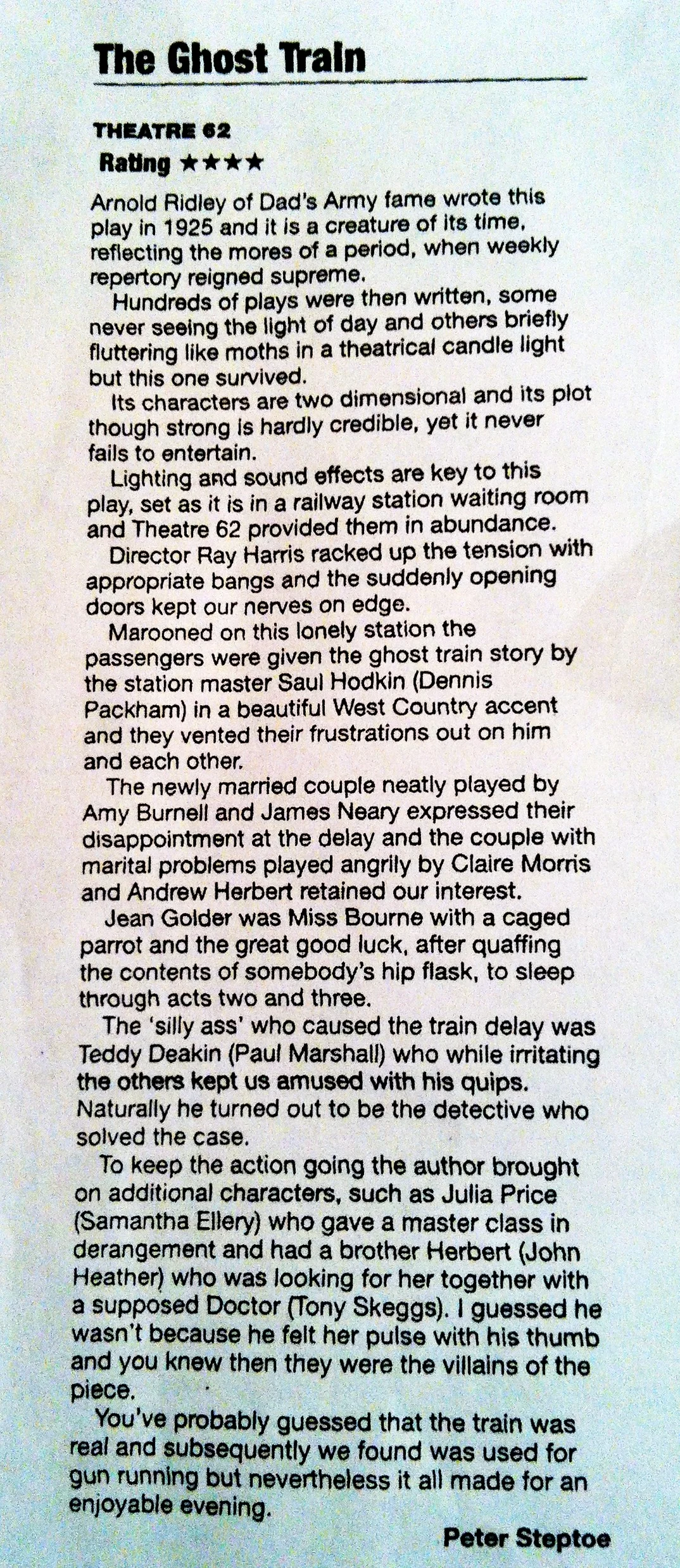 By Arnold Ridley. Directed by Ray Harris. Six passengers stranded at a remote station of the South Cornwall Joint Railway decide to stay the night in the cheerless waiting room. They soon regret their decision because they discover it is the anniversary of a terrible disaster; they soon see some ghostly and not-so-ghostly apparitions. The action tales place in the waiting room at Far Vale, a wayside station on the South Cornwall Joint Railway, during the course of a few hours in 1925.