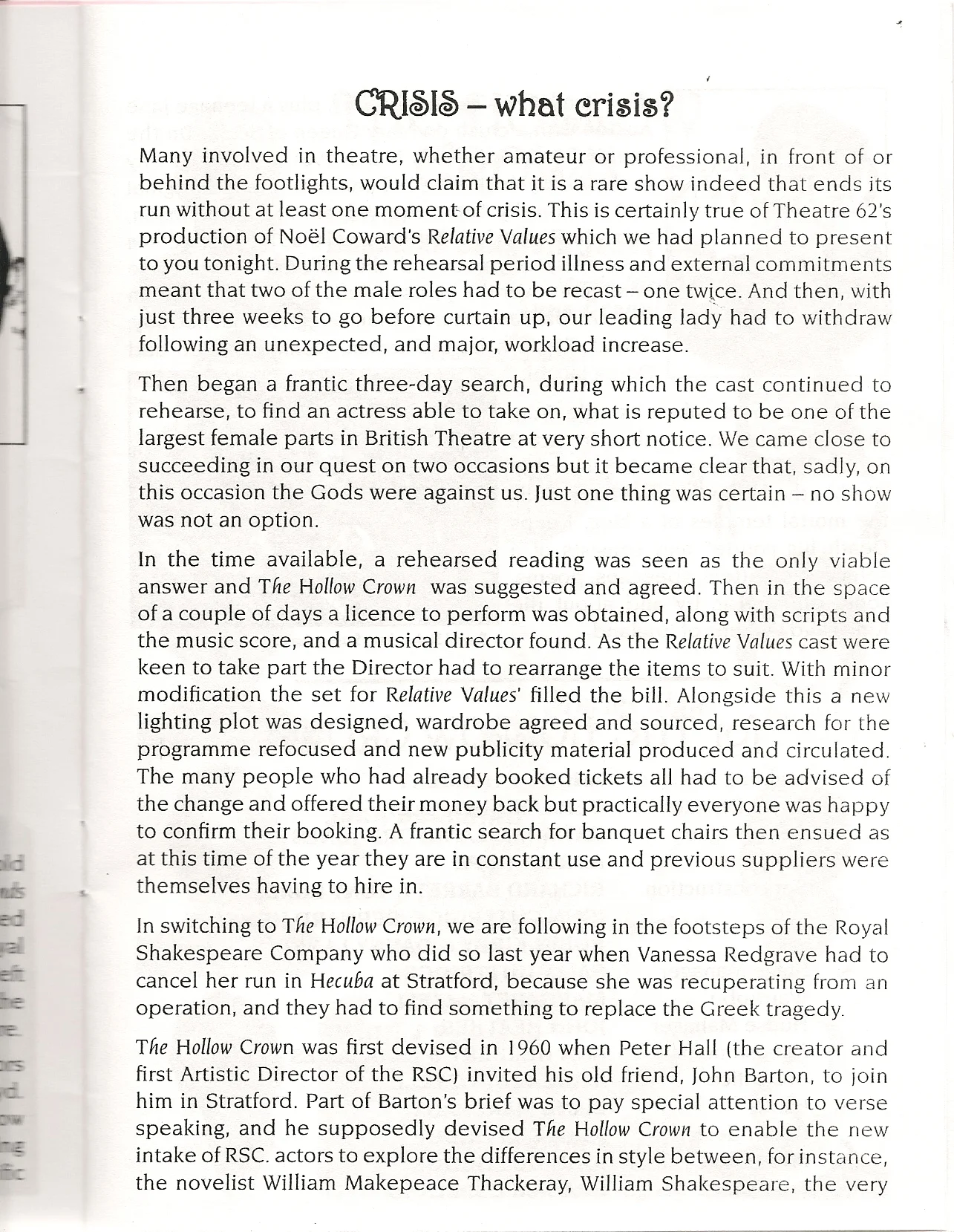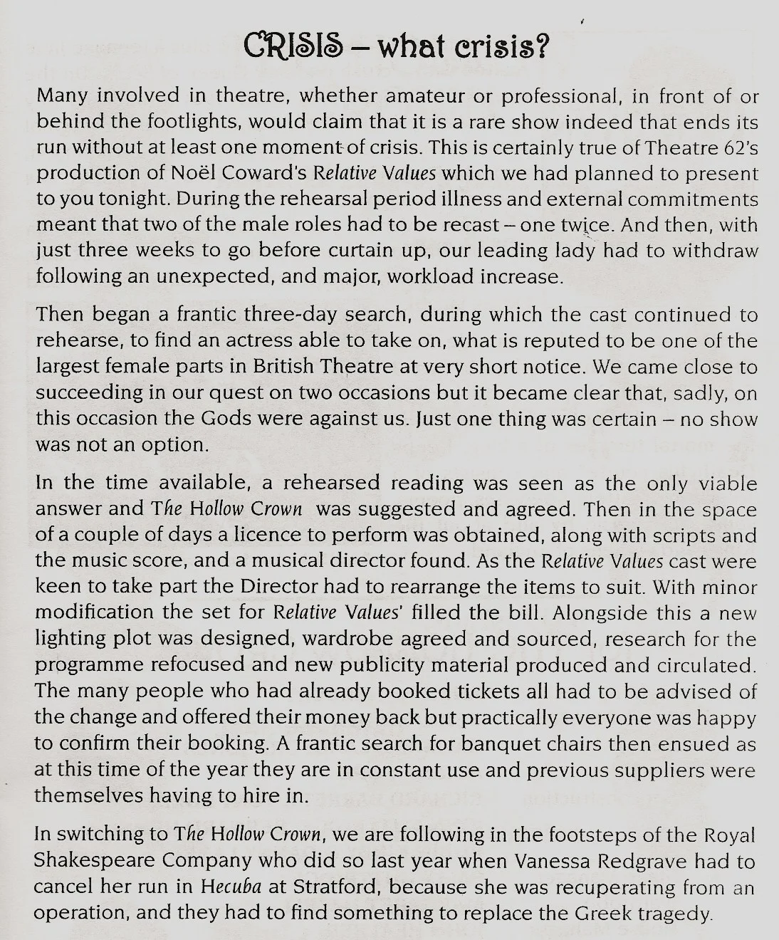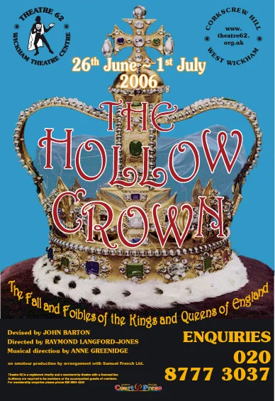 Devised by John Barton. Directed by Raymond Langford Jones. The Hollow Crown: the fall and foibles of the Kings and Queens of England. Readers and singers: Susan Adam, Ruth Aylward, Alexander (Felix) Catto, Muriel Kidd, John Oakenfull, Arthur Rochester, Pauline Sammon, Burtie Welland. Music Director: Anne Greenidge Crisis? What Crisis? (see below)